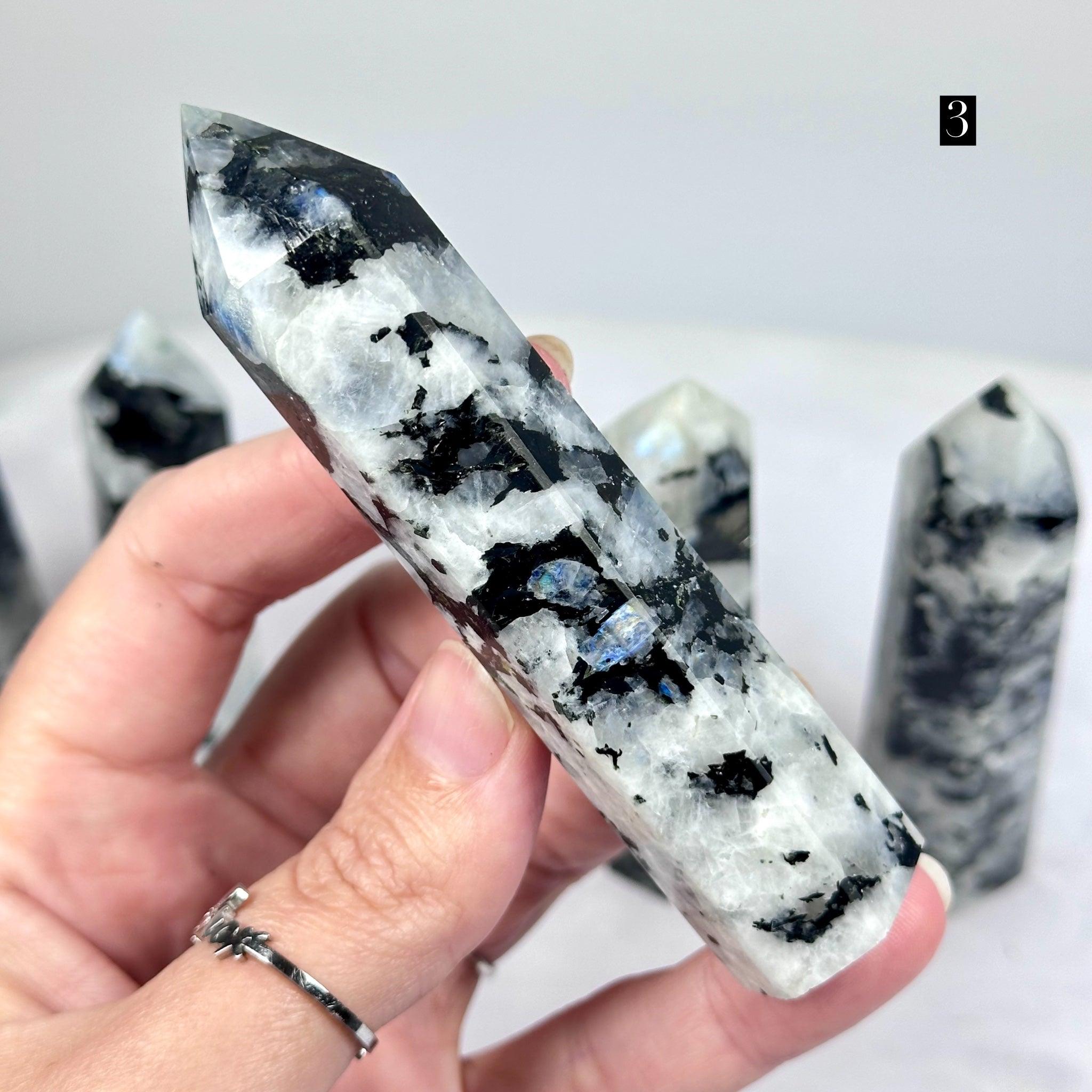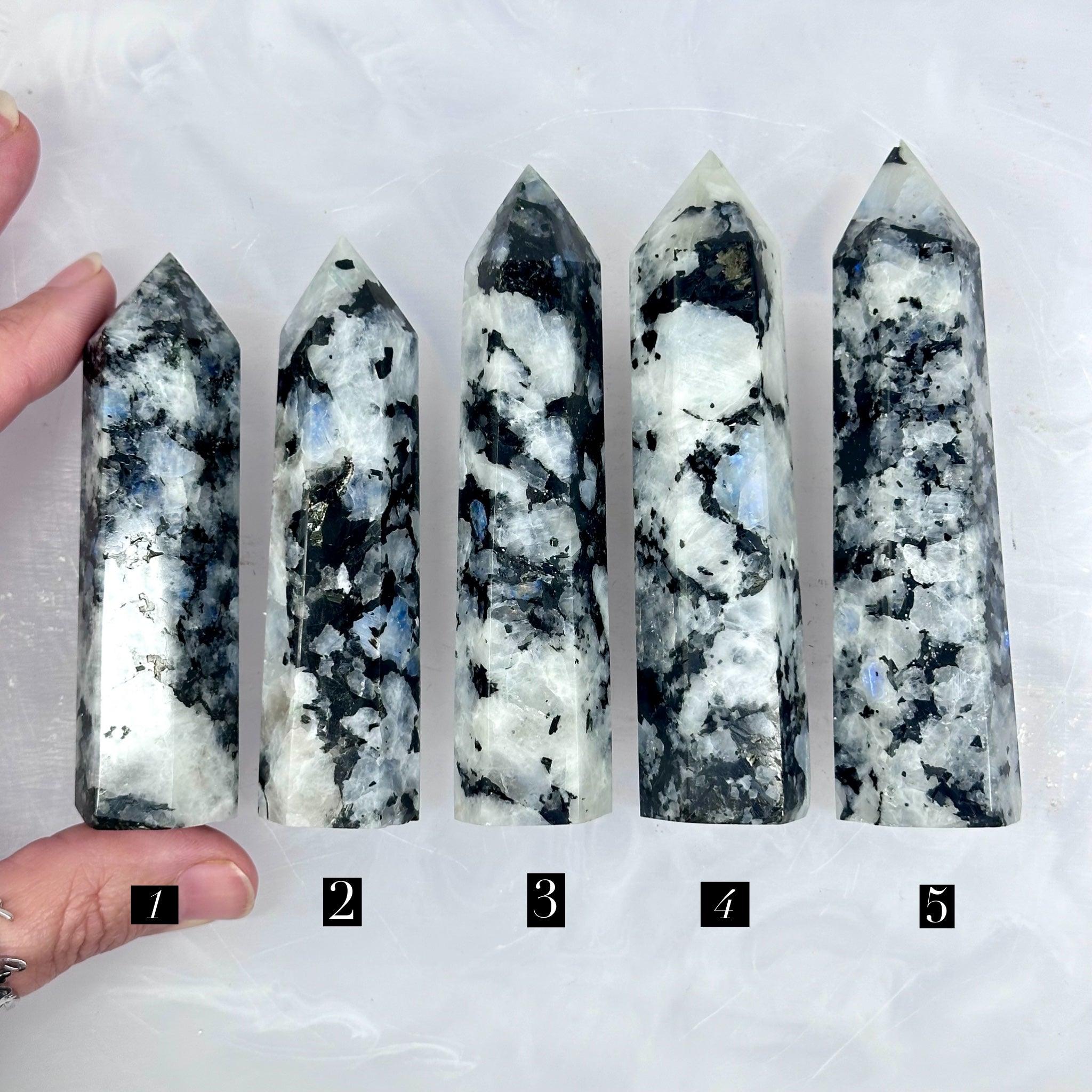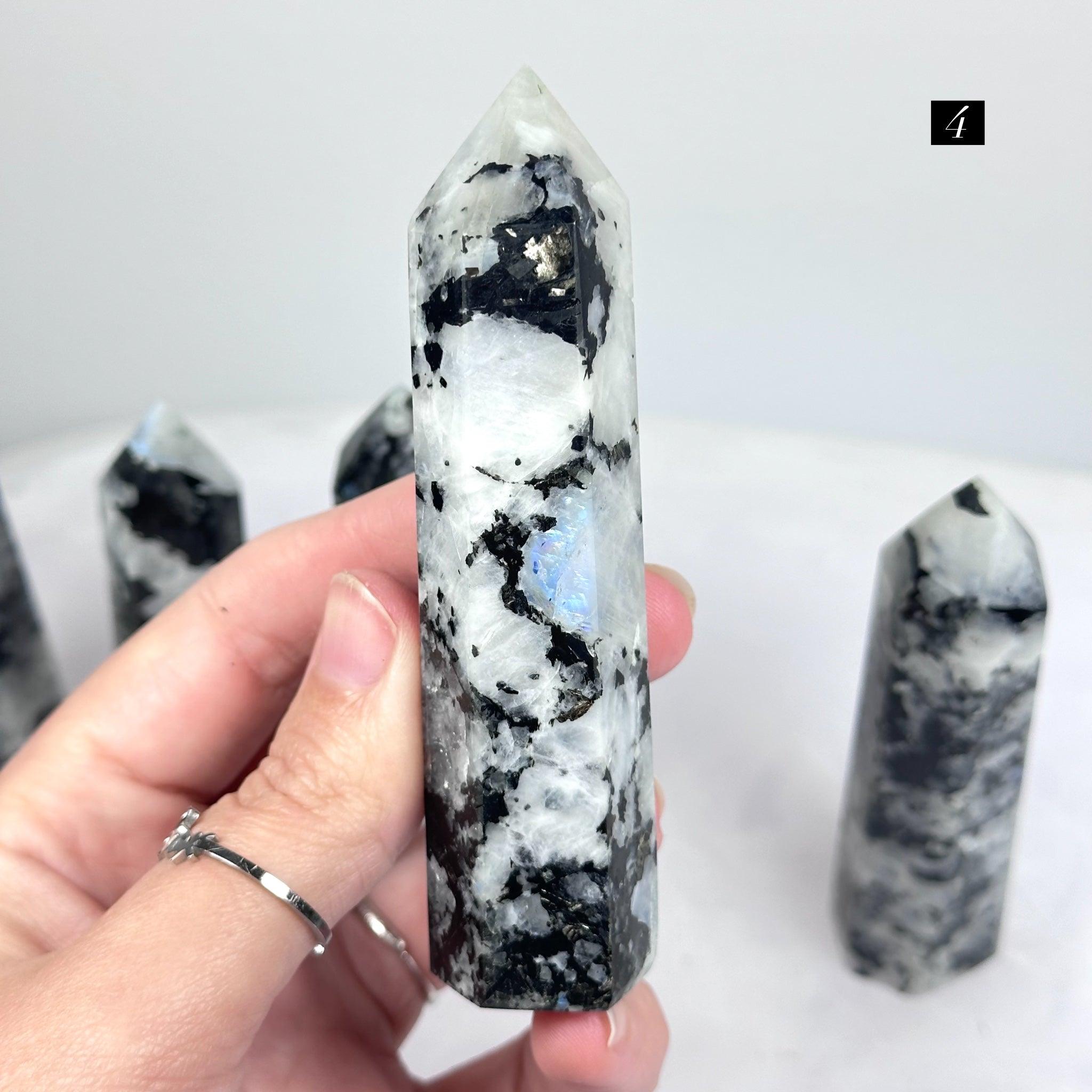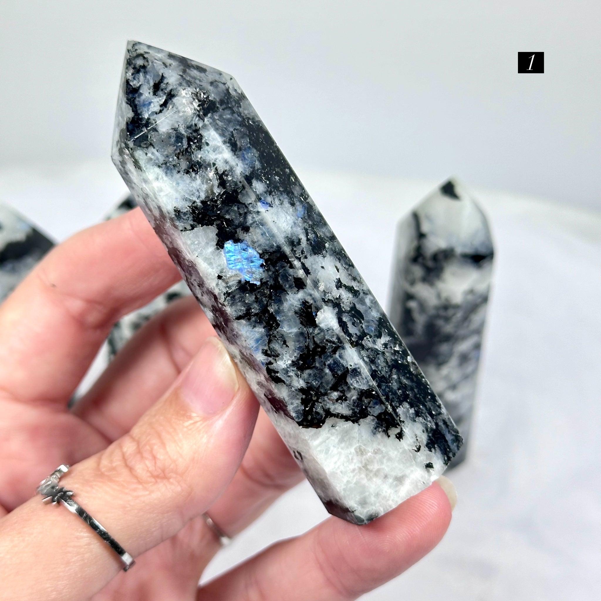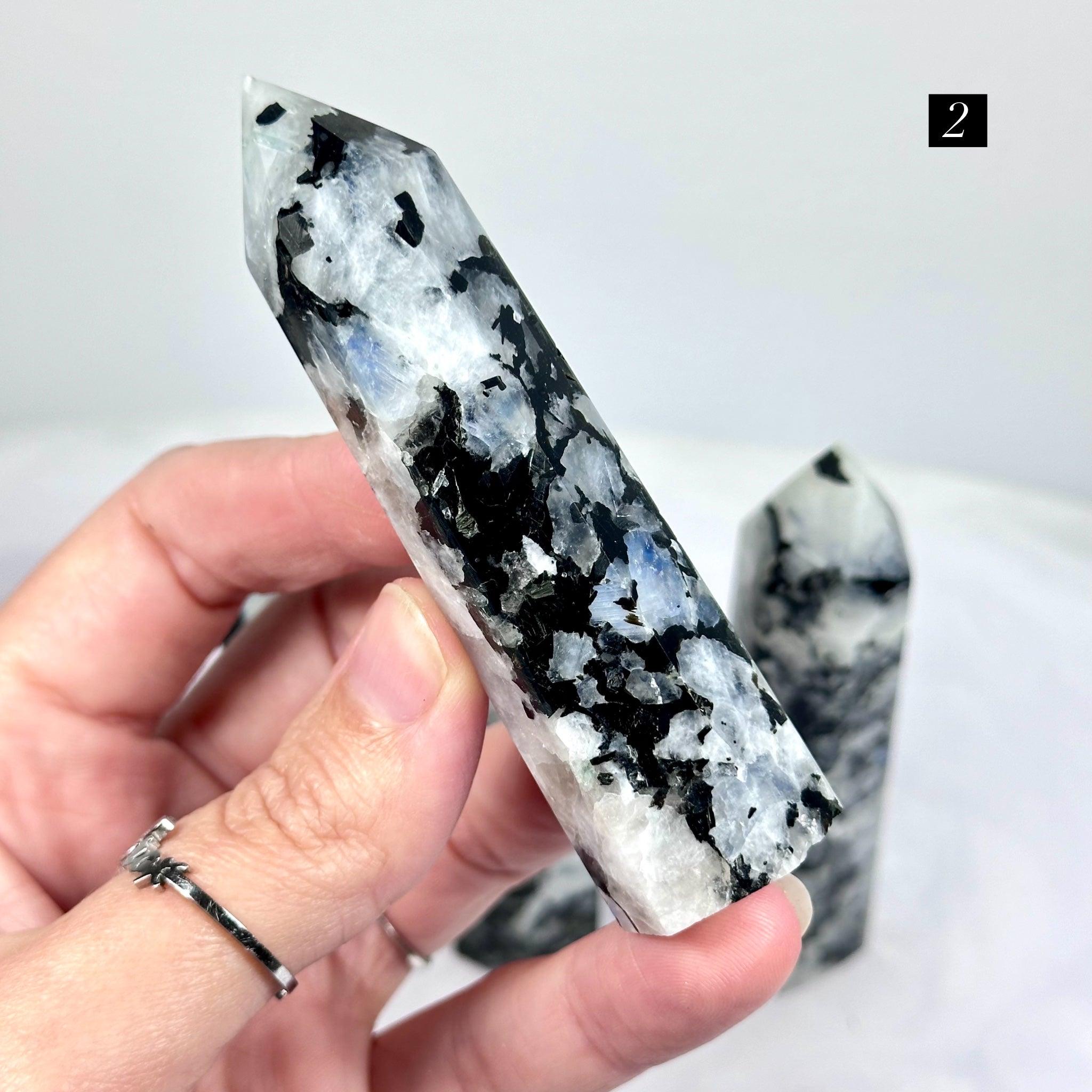Rainbow Moonstone – Polished Generator Points With Black Mica / 8.7–10.5 cm / 74–106 g / Madagascar
